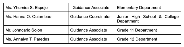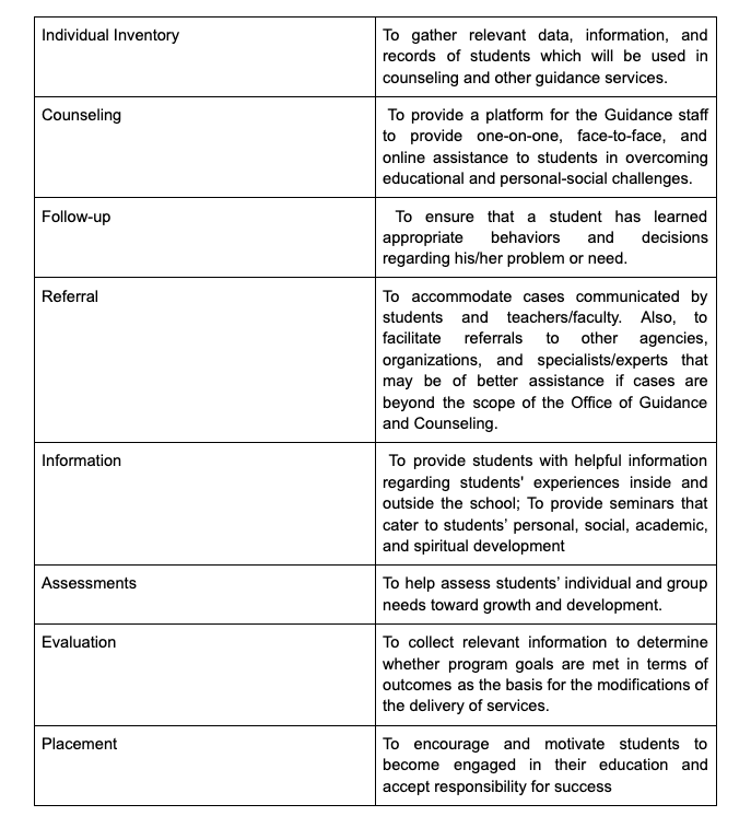 The Guidance and Counseling Office is committed to facilitating and promoting the holistic formation of students. Through various activities, experiences, and services rooted in their dedication to serving God, the office assists students in acquiring the knowledge and skills necessary to make informed choices and develop essential life plans.